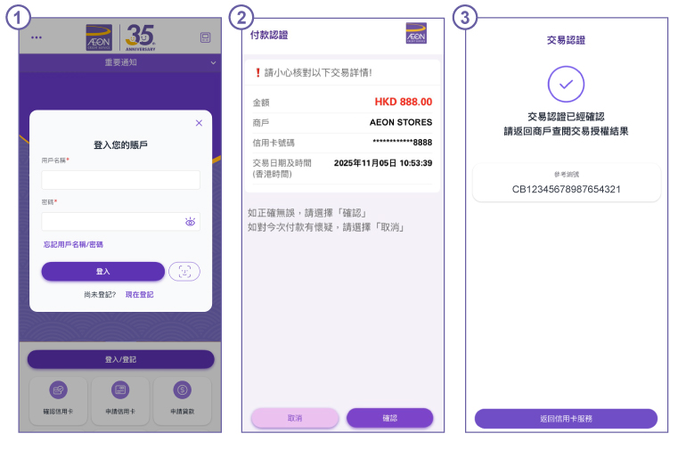 基於保安理由,AEON可能會要求您輸入驗證碼來驗證身份。請按螢光幕指示接收和輸入驗證碼。如您未能輸入驗證碼或驗證碼逾期,請致電AEON客戶服務熱線2895 6262。